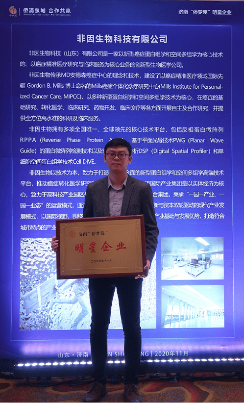 非因生物被授予“侨梦苑明星企业”称号 11月11日上午,由中央统战部侨务事务局指导,山东省委统战部、山东省侨办、中共济南市委、济南市人民政府主办的2020中国·济南华侨华人创新创业大会中,非因生物 被授予“侨梦苑”明星企业称号。